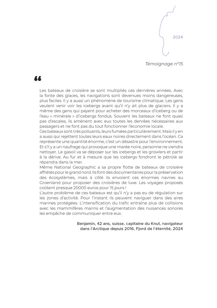 Saisons Polaires naît de la récolte de témoignages auprès d’habitants de l’Arctique sur une période de 8 ans.Elle collecte le ressenti et l’avis des locaux et visiteurs réguliers sur l’impact de la mondialisation et du changement climatique.Ceci, sans émettre de jugement ou d’interprétation, dans une volonté de transmettre une parole juste et une retranscription de nos échanges sincère, sans y transposer mon regard et mon appréciation de voyageuse occidentale..
